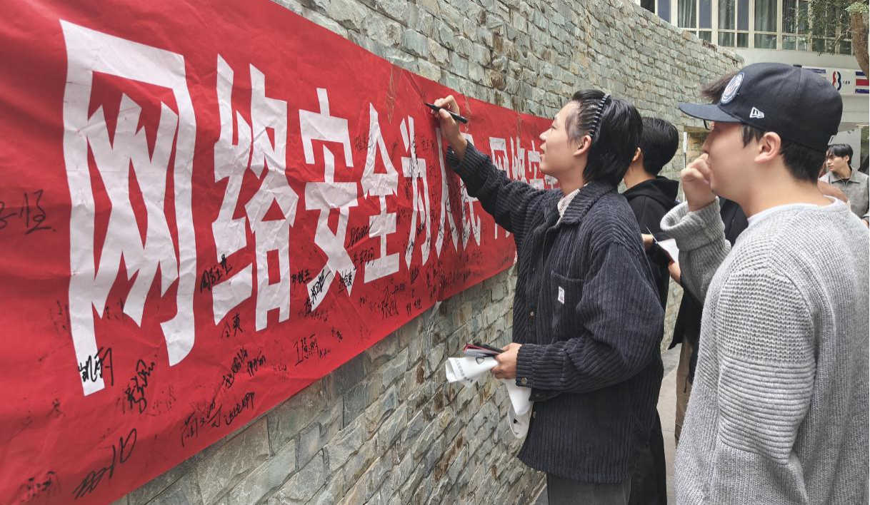 学生在“网络安全为人民 网络安全靠人民”横幅上签名