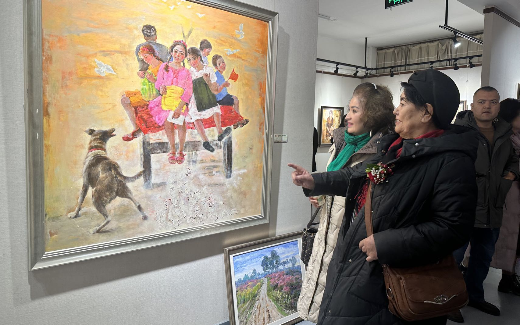 参观“艺心共铸 艺美共美——莫合德尔·亚森美术作品展”时,学校党委副书记、院长莫合德尔·亚森与老同志们交流了自然风光、人文风貌等不同题材作品的创作灵感和绘画时的心路历程。参观“故乡情——迪丽达尔·玛娜甫油画作品展”时,美术学院退休教师迪丽达尔·玛娜甫向老同志们分享了此次办画展的初衷,作为土生土长的新疆人,她想通过色彩丰富的油画颜料描绘出天山南北辽阔的自然风光和独特的风土人情。