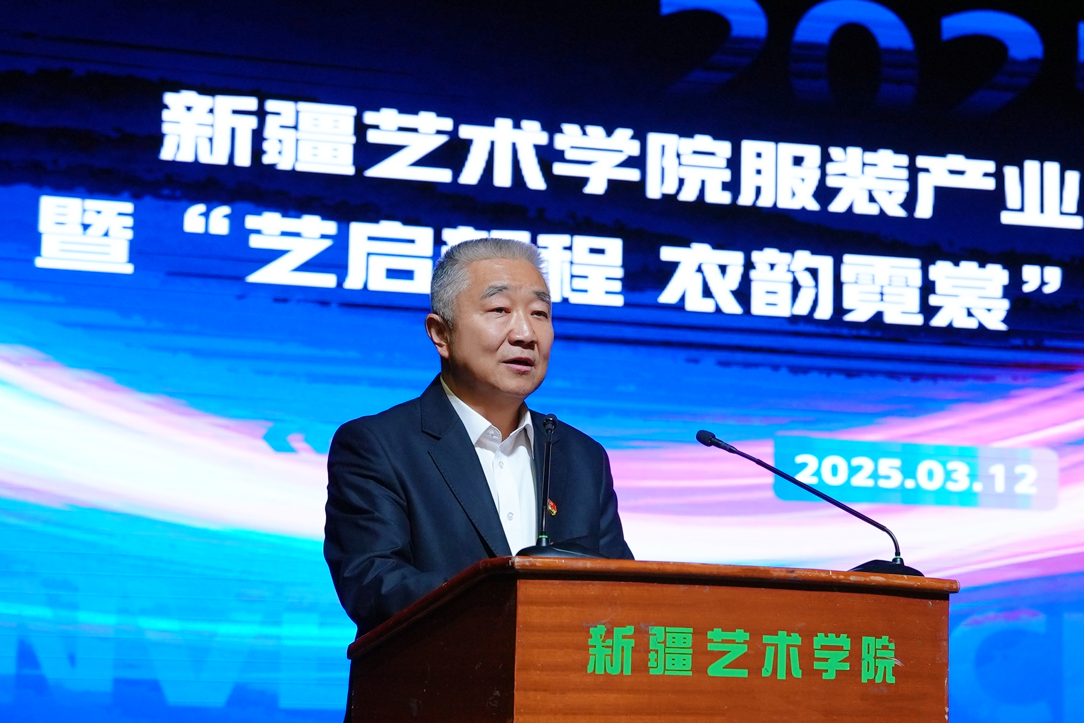 章立新书记在致辞中讲到,服装产业学院正式挂牌,是学校深化教育教学改革和创新性人才培养的重要举措,更是积极响应国家产教融合战略的具体行动。多年来,学校坚持为党育人、为国育才办学导向,落实立德树人根本任务,突出内涵发展与质量建设,为繁荣文化艺术事业、推进社会文明建设做出了积极贡献,被誉为“丝绸之路文化传播的使者”和“天山脚下艺术家的摇篮”。近年来,学校把培养高层次创新型文艺人才、更好地服务社会作为办学治校的重要使命,积极融入国家、区域重大发展战略。随着新疆棉纺织服装产业的蓬勃发展,学校紧抓机遇,依托设计学院服装与服饰设计专业的资源优势,联合新疆服装设计师协会的行业力量,全面推进服装产业专门人才的培养。