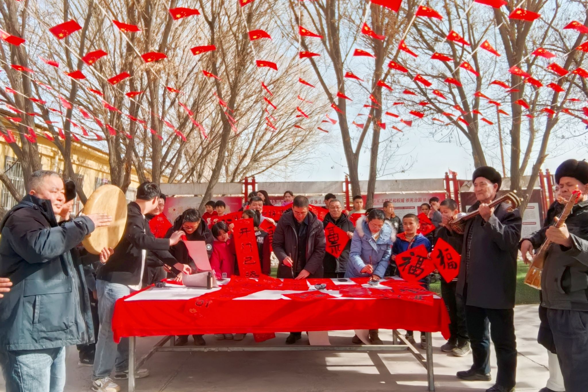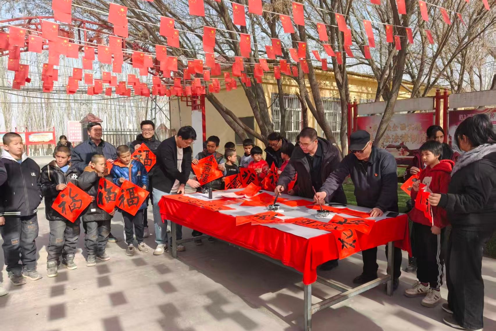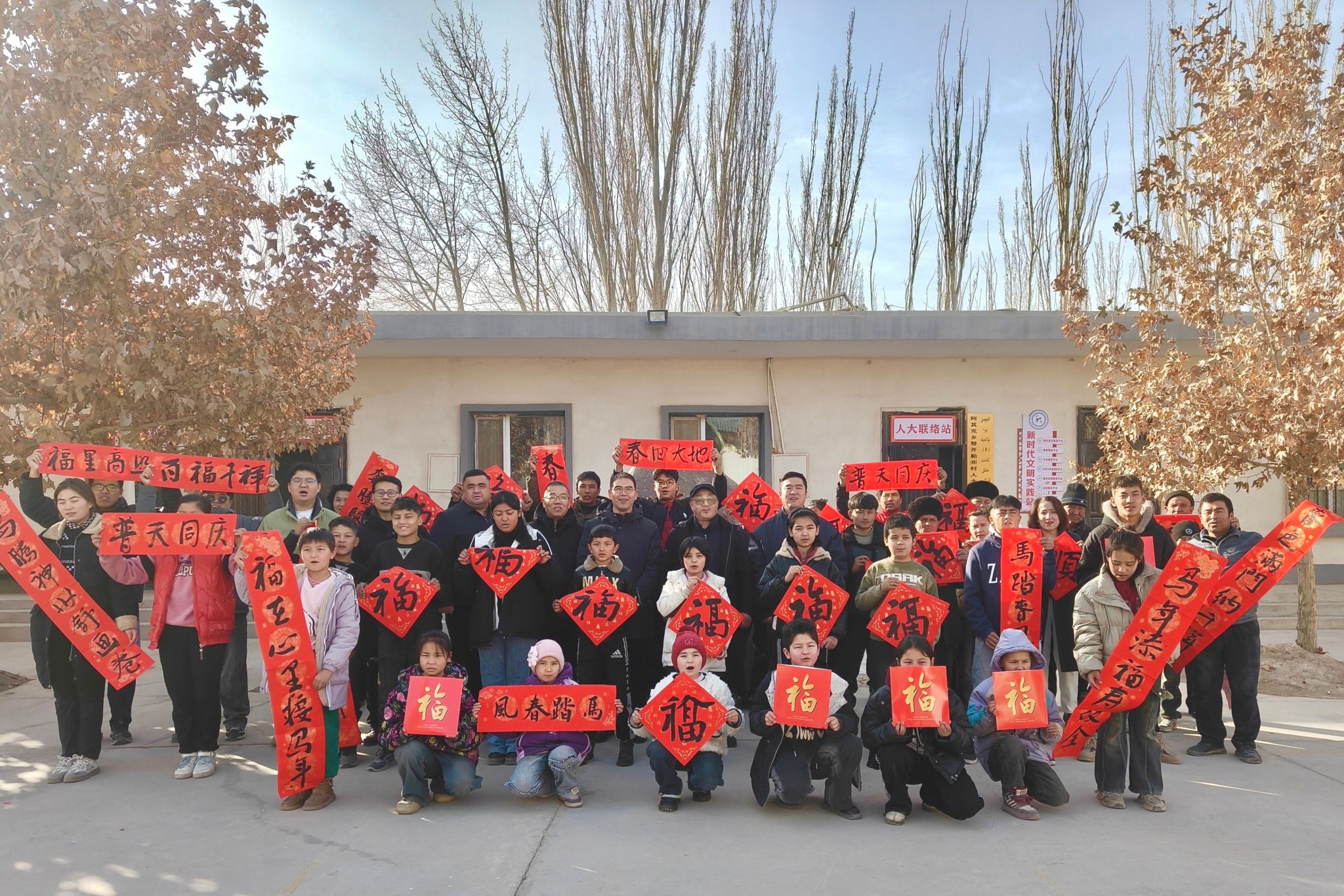 立春启序,迎新纳福。新春佳节来临之际,根据学校党委统一安排,党委常委、宣传部部长周达疆和书法学院专业教师团队赴学校驻村工作点喀什地区岳普湖县阿其克乡,以铸牢中华民族共同体意识为主题,开展“春联送福进万家”活动,以笔墨传递新春暖意,送上新年祝福。
