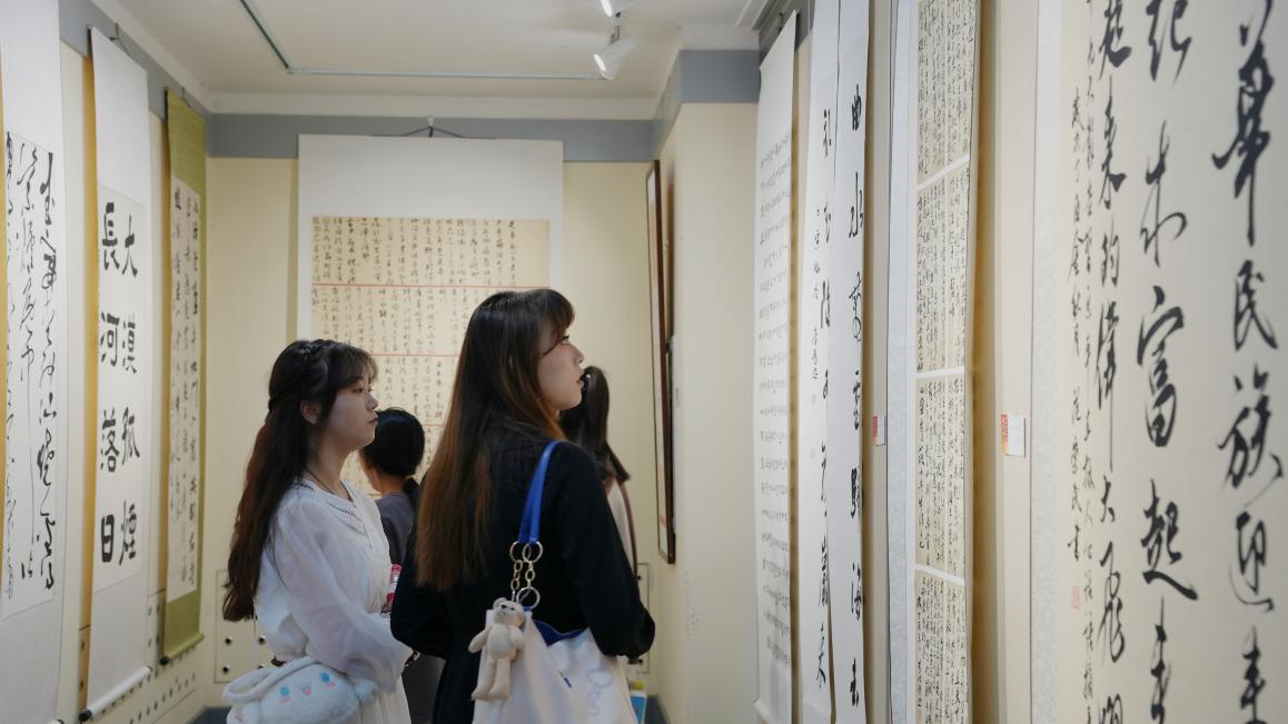 学生参观书法教学实践成果展