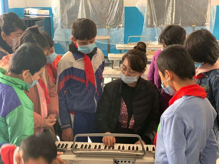 学校教师教学生弹奏电子琴