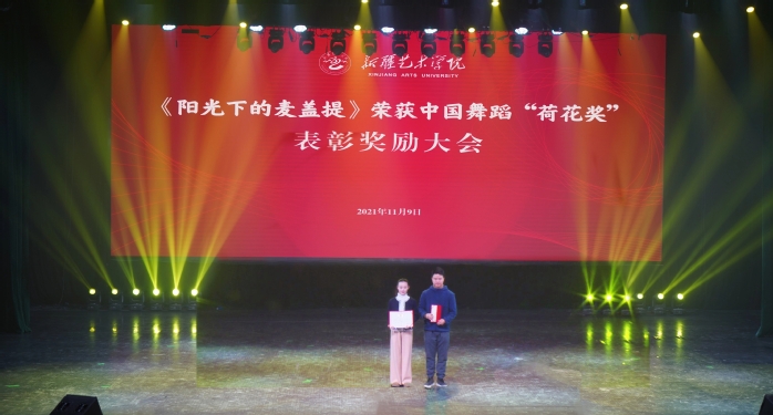 学校对中国舞蹈“荷花奖”作品《阳光下的麦盖提》编创教师及参演学生进行了表彰奖励。观看了中国舞蹈家协会主席、中国文学艺术基金会副理事长冯双白,云南省舞蹈家协会名誉副主席朱红两位评委对该舞蹈作品的点评实况。授予编创教师张鹏、李梦雨“新艺杯”编导一等奖。授予参演学生“新艺杯”表演一等奖。召开“《阳光下的麦盖提》——新艺放飞我的梦想”师生座谈会。学校党委常委、副院长全立新主持座谈会。师生围绕教学实践作品《阳光下的麦盖提》编创历程、参演经历等,从学校各民族学生共同学习、共同生活、共同进步、相互了解、相互欣赏、相互帮助以及在“三进两联一交友”活动中广大教师与学生及家长无微不至关心关爱学生、促进学生德智体美劳全面发展等方面进行了交流。
