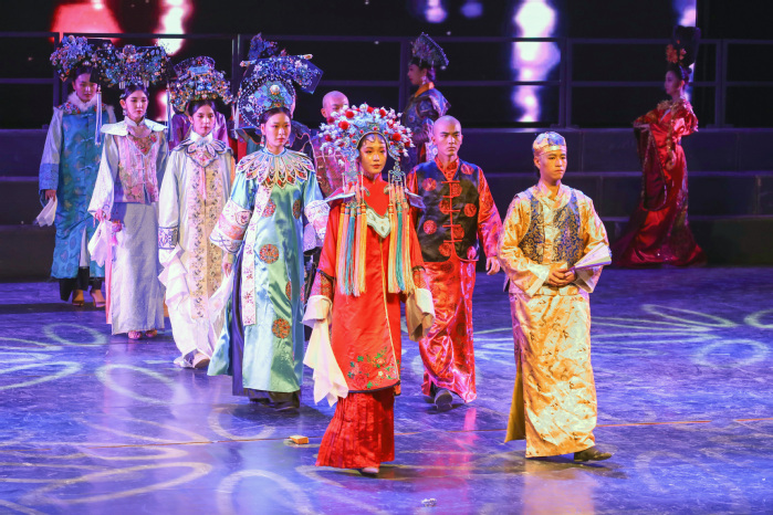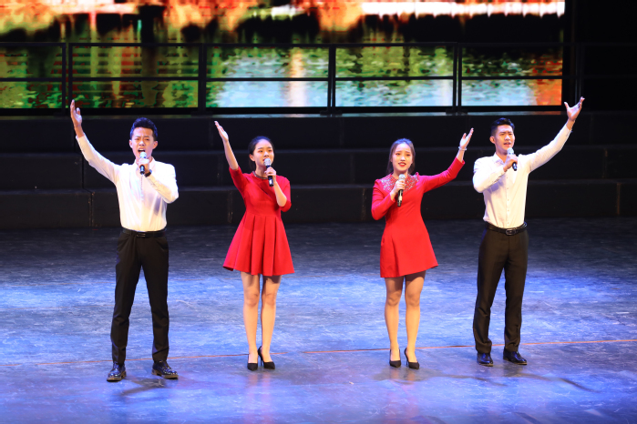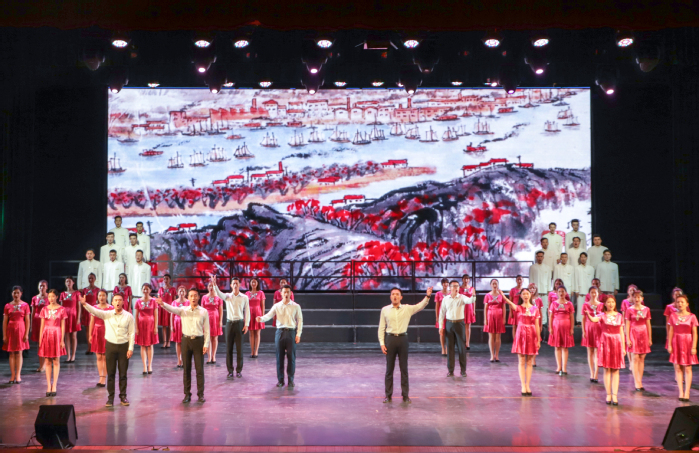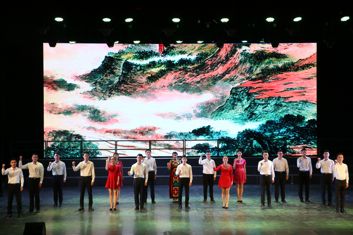 一副中国画背景徐徐展开,毛泽东经典诗词映入眼帘,在豪迈的朗诵声中,演出拉开序幕,朗诵诗词以时间的脉络,生动展现了中国共产党团结带领中国人民经过艰苦卓绝斗争建立新中国的伟大历程。“爸,女儿没时间陪您了。”“与其在医院,还不如多给孩子教点东西。”小品《传戏千里》讲述了来疆支教身患白血病的京剧老师为传承中华传统文化、繁荣新疆文艺事业甘愿奉献自己的感人故事,让在场观众深深为之感动。诗朗诵《嘉兴南湖红船之铭》弘扬了开天辟地敢为人先的首创精神。诙谐幽默的小品《超级女兵》展示了新时代通讯女兵为祖国奉献青春的风采。诗朗诵《祖国,一首唱不完的恋歌》表达了对祖国的深情厚意。“绿水青山就是金山银山”,在堆满矿泉水瓶、塑料袋的道具背景下,音乐剧小品《家园》表达了人们保卫地球、保护环境刻不容缓的心声。在动感旋律和中国风的音乐中,同学们身着时尚造型和唐代、清代人物服装,展示了中华传统服饰设计的多样性。诗朗诵《回延安》讴歌了全心全意为人民服务的精神和自力更生、艰苦奋斗的延安精神。