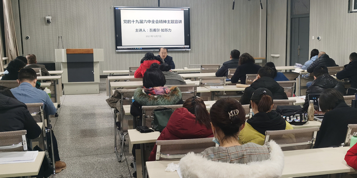 为深入学习贯彻党的十九届六中全会精神,11月以来,学校开展党的十九届六中全会精神系列专题宣讲,学校党委书记章立新作了专题党课辅导报告,学校党委领导班子成员莫合德尔·亚森、樊文平、吾甫尔·如苏力、全立新、斯尔哈孜·布兰拜、周达疆深入各联系学院作了宣讲辅导,全校党员处级干部分别在本部门、本单位进行了宣讲。