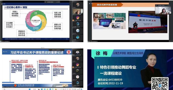 “教师教学能力提升”专题培训邀请了华中师范大学杨九民教授、中国传媒大学研究生院副院长李楠教授和石河子大学药学院副院长李乐教授分别以《高校教学改革与创新》《混合式教学、融合式教学的理念与实践》《课程思政示范课及案例库建设经验分享》为题,结合教学案例,从教学改革与创新、混合式教学、融合式教学建设的意义、方法及课程思政建设目标、关键和重点出发,探索教学改革和课程思政建设新路径和新方法。11月19日,培训还将邀请云南艺术学院舞蹈学院徐梅教授以《特色引领推动舞蹈专业一流课程建设》为题,围绕一流课程申报进行深入探讨。