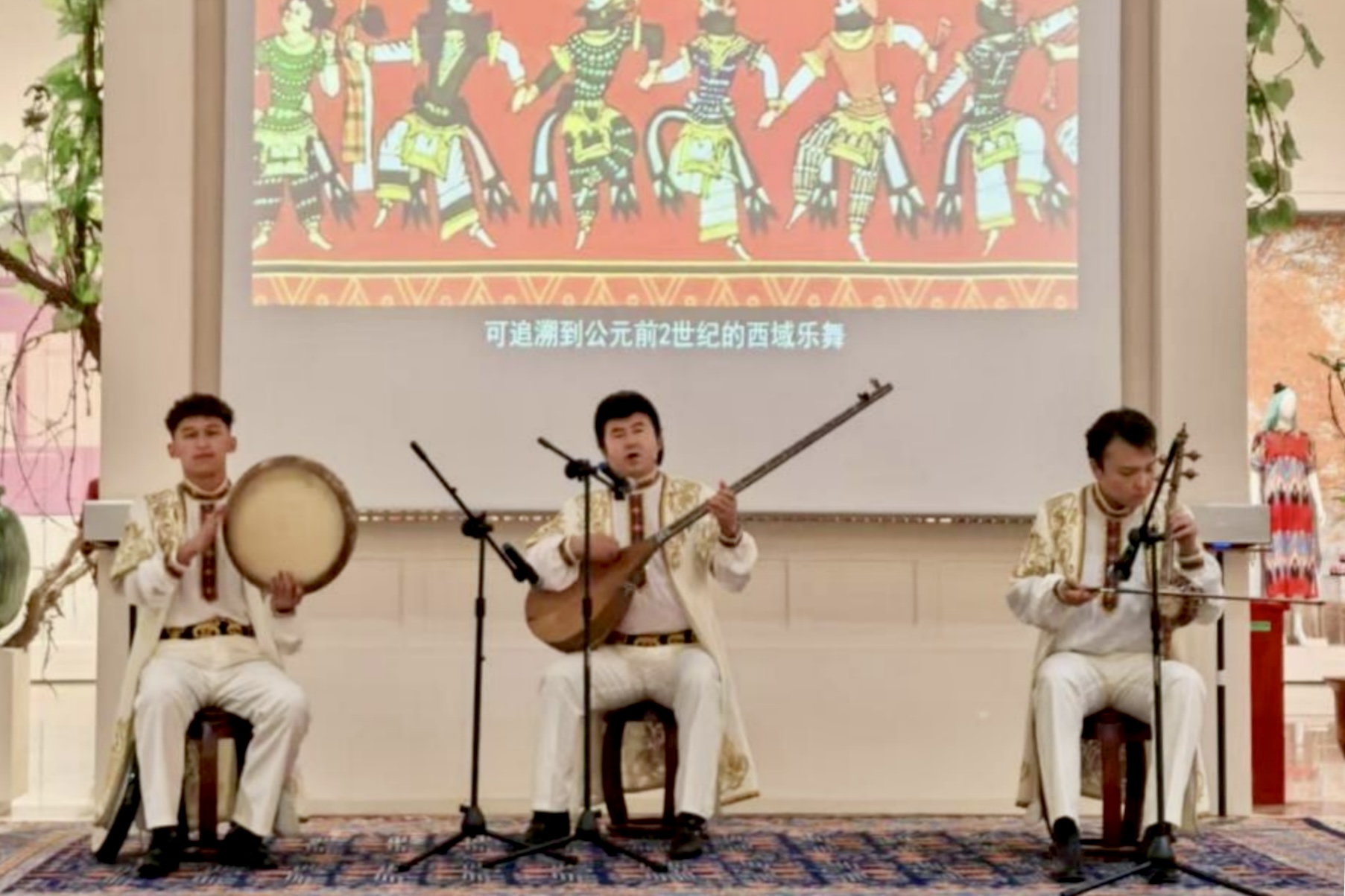 活动现场,我校师生应邀精彩演绎《且比亚特木卡姆》经典段落,呈现了木卡姆艺术的原生风貌与民间音乐的醇厚韵味,参展观众沉浸式感受到了其独特的艺术魅力。