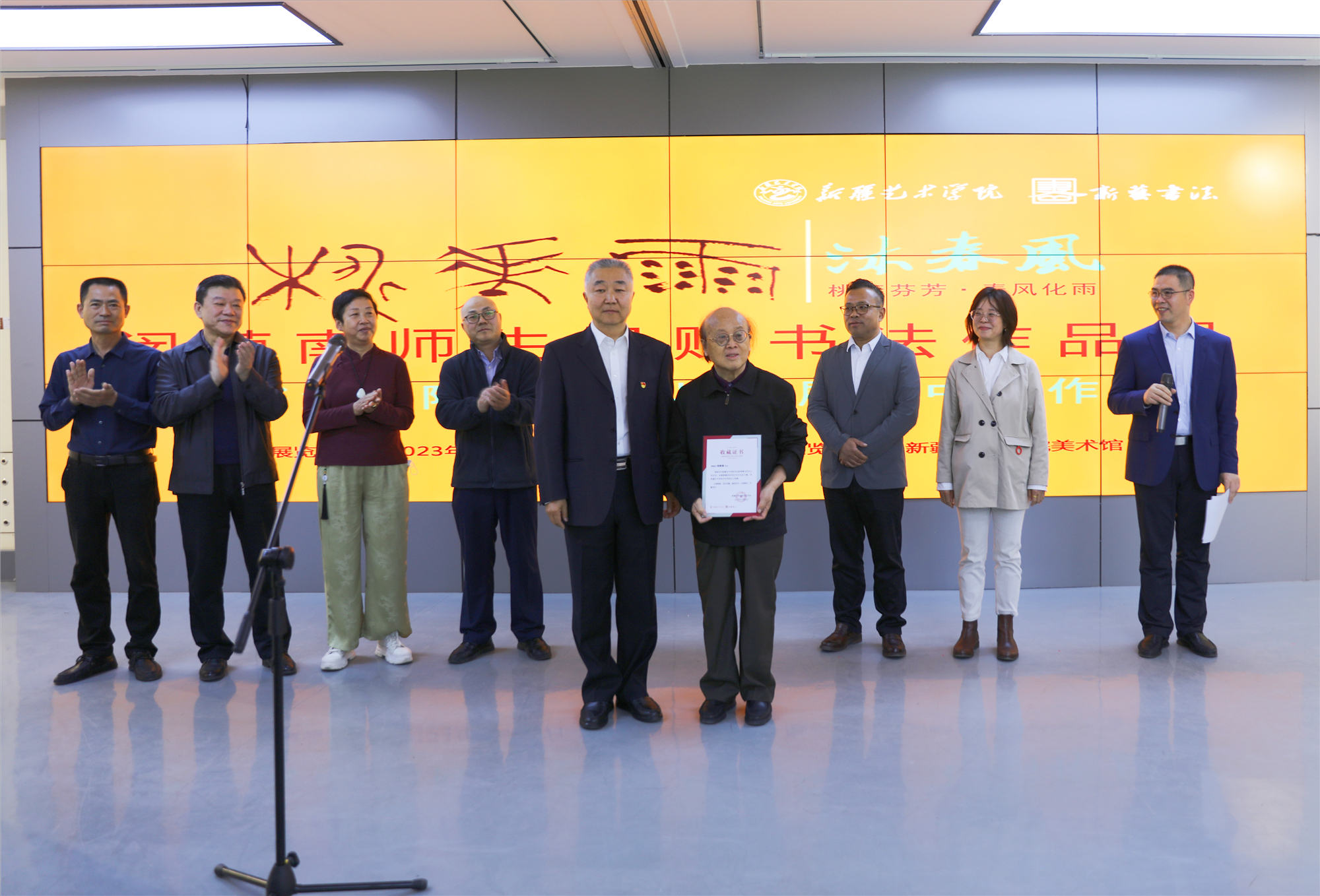 5月31日,桃花雨·闵荫南师生捐赠书法作品展、沐春风·书法学院研究生毕业作品暨中期汇报作品展在我校美术馆开幕。学校党委书记章立新出席并宣布开幕,学校党委常委、宣传部部长周达疆出席并致辞,书法学院名誉院长闵荫南、书法界知名专家学者和专业师生200余人参加了开幕式。开幕式上,章立新为闵荫南先生颁发了捐赠收藏证书。新疆书法家协会副主席陈伯阳和我校书法学院党委书记李琼瑶共同为西域书法研究中心成立揭牌。