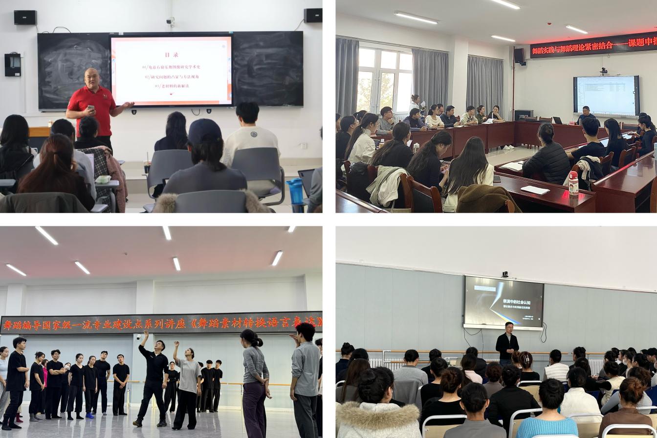 10月24日至11月28日,舞蹈学院先后邀请中央民族大学王建民、北京舞蹈学院高度、张晓梅和张云峰、新疆师范大学肖尧轩、上海外国语大学李然,分别作了题为《舞蹈实践与舞蹈理论紧密结合——课题申报专题辅导》《舞蹈素材转换语言表达》《龟兹石窟伎乐壁画研究的新问题、新方法、新材料》《表演中的社会认知:“理论融合与实践验证的探索”工作坊》的专题讲座,涵盖课题申报辅导、舞蹈编创理论与实践、龟兹乐舞文物研究、表演社会认知理论等多个方面。