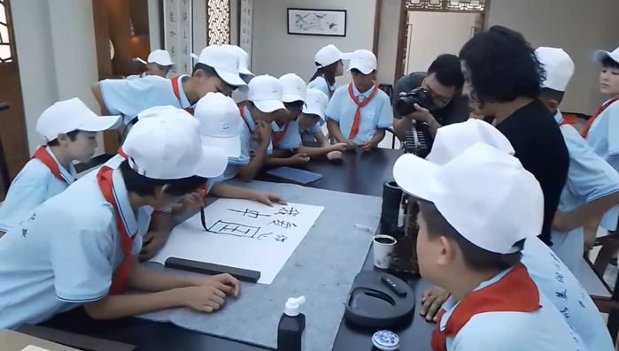 学生在中华文化体验馆写毛笔字“我爱您,中国”
