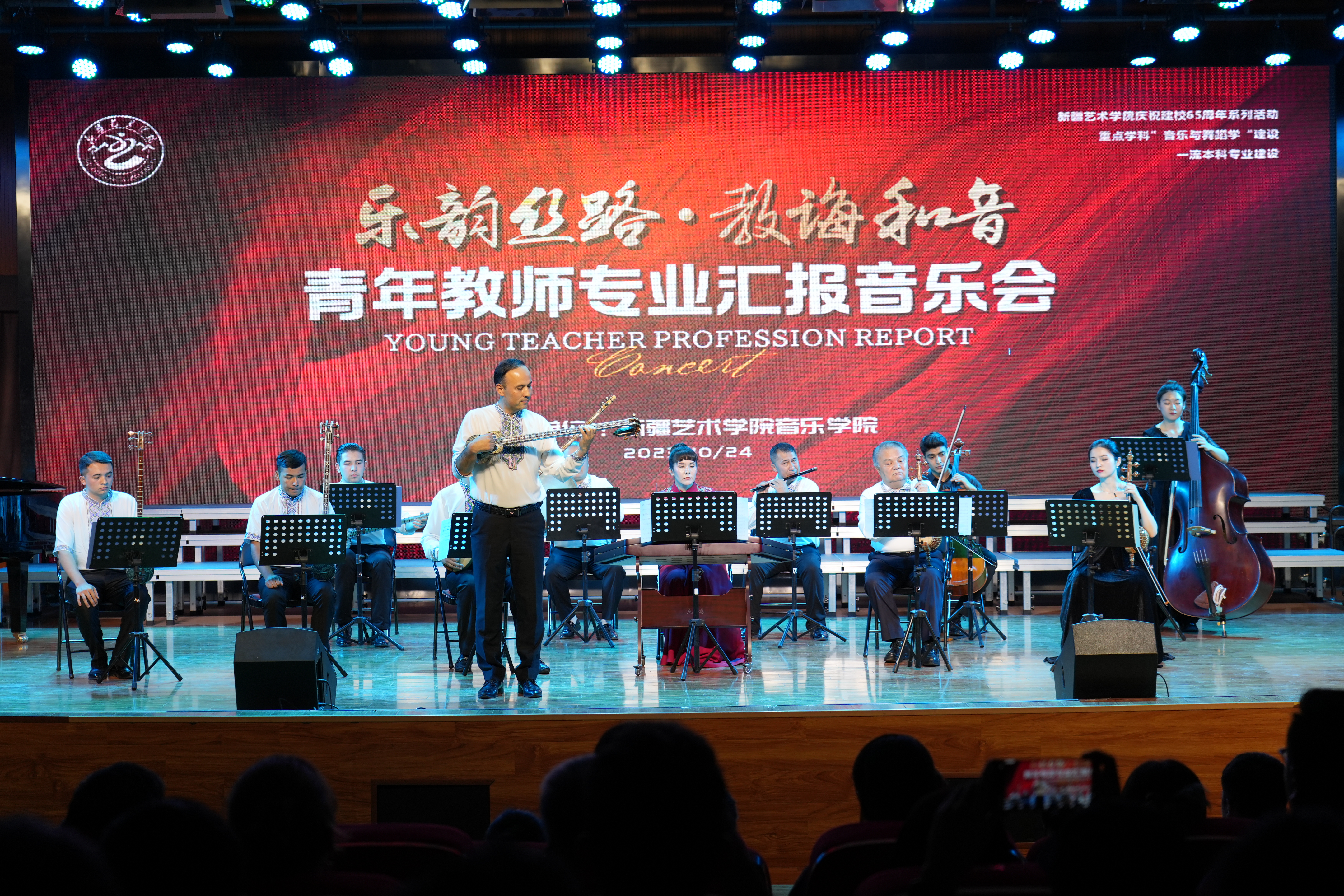 本次音乐会分两场进行。青年教师演奏、演唱了《歌剧魅影》《为艺术,为爱情》《爱之忧伤》《秦生啊,你还好吗》《青春舞曲》《阳光照耀塔什库尔干》等中外经典名曲以及《坎儿井之游》《木卡姆幻想曲》《丰收》《草原小姐妹》《第二二胡协奏曲——西行》等多首中华优秀传统名曲,勾勒出丝绸之路上绚烂多彩的蓬勃画卷,展现了中华音乐文化的无穷魅力。